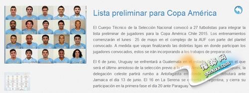 乌拉圭公布美洲杯27人名单北京时间5月11日晚,乌拉圭主帅塔巴雷斯公布了2015美洲杯27人初步名单,卡瓦尼、戈丁、吉梅内斯和斯图亚尼等人领衔,头号前锋苏亚雷斯因禁赛和参加杰拉德告别赛的双重原因落选。此外,尤文铁卫卡塞雷斯因伤落选,参加2014年巴西世界杯的弗兰、佩雷斯和卢加诺也无缘此次大名单。