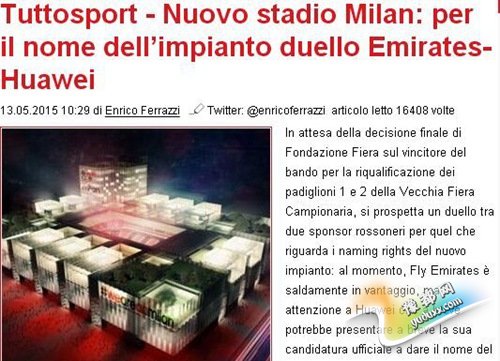 但是据《米兰新闻网》的最新消息,来自中国的华为公司也对米兰的新球场冠名权十分感兴趣,值得一提的是,在本赛季早些时候,华为公司就与米兰俱乐部有过合作,米兰的球员们为华为公司的手机拍摄过一段广告片。