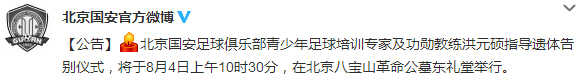 《国安官方公告:洪元硕追悼会8月4日于八宝山举行》由河南新闻网-豫都网提供,转载请注明出处:http://sports.yuduxx.com/gnty/216965.html,谢谢合作!