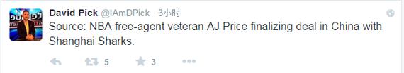 大卫-皮克曝出AJ-普莱斯签约上海北京时间9月5日消息,在昨天曝出签约唐子豪外,今天,上海队再曝出签约消息。据欧洲篮球专家大卫-皮克在个人社交媒体上透露,在NBA征战多年的AJ-普莱斯签约上海。