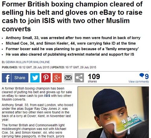 现年33岁的斯迈尔来自于伦敦东部,他曾经是英国的中量级拳王。但是受到了极端组织ISIS的洗脑,他已经彻底变成了一个“亡命徒”。此前他曾在网络上通过视频发表了一系列激进言论,而现在为了给前往叙利亚参加组织凑集路费,安东尼更是从去年9月份开始,在网上出售自己的拳击手套和拳击鞋,他同时也将自己获得的金腰带放到网上拍卖,但没有遇到有兴趣的买家。
