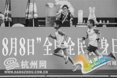 8月8日是全民健身日。7日傍晚,全市100名孩子在江干区体育中心进行了“小铁人三项”的比赛。 记者 金轲 摄商报记者 王金成